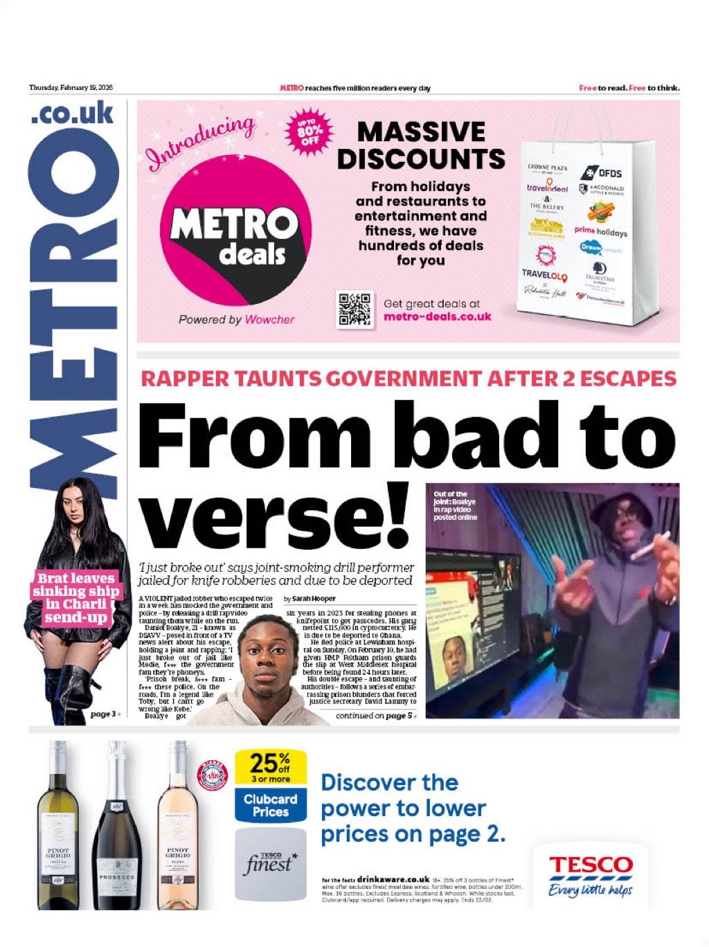 A drill performer convicted of robberies twice absconded, then posted a video saying “I just broke out” while taunting ministers. He faces deportation. The case has intensified scrutiny of prison security and the handling of offenders awaiting removal.