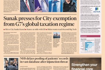 The Financial Times says Rishi Sunak is pushing to win a carve-out for the City’s big banks in the G7’s drive for a new global tax system to cover the world’s “largest and most profitable multinational enterprises”.