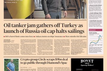 The FT reports that oil tanker traffic has formed off Turkey as sanctions limit the price of Russian oil to $60 a barrel.