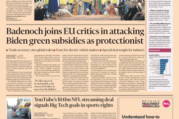 Kemi Badenoch, the International Trade Secretary, said US President Joe Biden’s green subsidies are protectionist – that’s on the front page of the Financial Times.