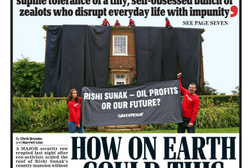 A Greenpeace protest on the prime minister’s mansion roof and the need to review Rishi Sunak’s protection plans makes the front page of the Daily Mail.