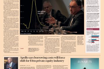 Interest rates hitting a 15-year high without signs of easing is the lead story in the Financial Times.