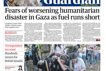 The Guardian reports on the UN agency’s warning of a potential halt in Gaza’s relief operations due to fuel shortage.