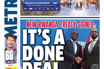 The Metro reports on James Cleverly and Vincent Biruta’s handshake marking the UK’s new asylum treaty with Rwanda.