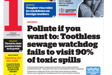 The i paper criticises the Environment Agency for inspecting only 10% of water pollution incidents in a year.