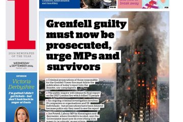 The i reports that campaigners are demanding criminal prosecutions for those responsible for the Grenfell Tower fire once the disaster report is released.