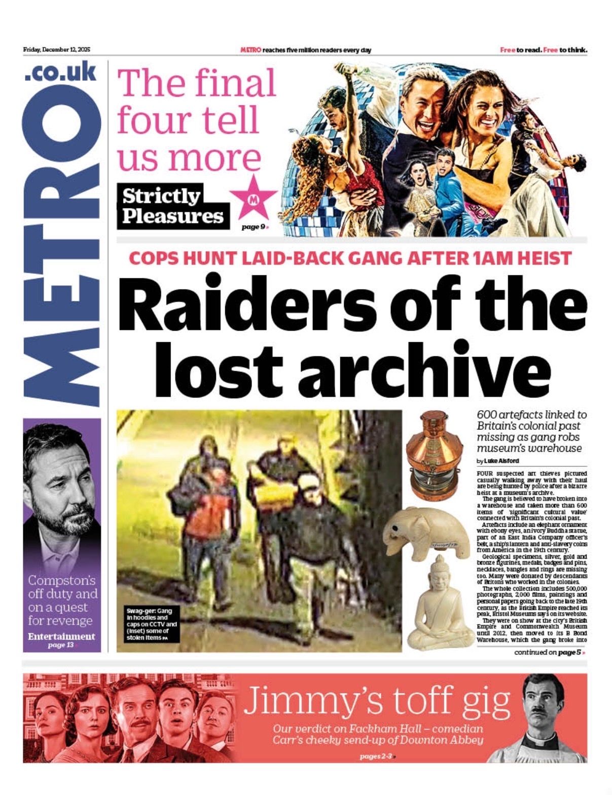 Police are seeking a gang after a 1am raid on a museum warehouse. More than 600 items, including coins and cultural artefacts linked to Britain’s colonial era, are missing. CCTV shows four suspects carrying boxes. Officers are cataloguing losses and appealing for information.