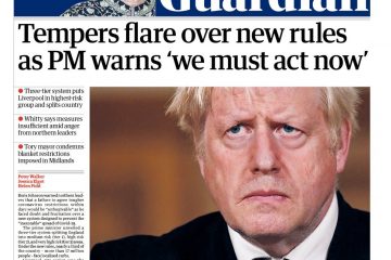 The Guardian says Boris Johnson has warned northern leaders that failure to agree tougher COVID restrictions within days would be “unforgivable”.
