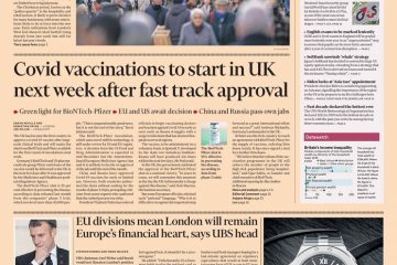 COVID vaccinations beginning in the UK next week, after regulators gave the green light to the Pfizer/ BioNTech jab, leads the front of the Financial Times.
