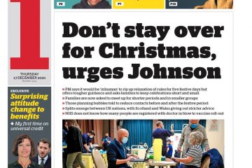 The Daily Mail’s headline is “the fright before Christmas”, which describes Boris Johnson’s warning that families should shorten their Christmas celebrations.People across the UK were told not to stay overnight with their ‘Christmas bubble’, keep windows open and don’t gather in large crowds for the Boxing Day sales.Read our full story on the government’s Christmas guidelines here.
