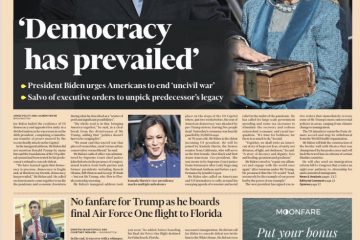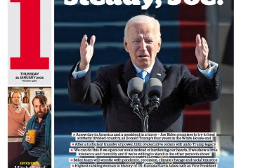 The Daily Mail has the headline “Don’s gone… Let’s go Joe” as the paper says Mr Biden tried to turn the page on four of the most turbulent years in America’s history as he pledged he would serve those who did not vote for him as diligently as those who did.