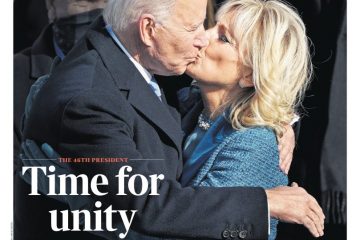 The Times pictures Joe Biden kissing his wife Jill. The paper says that after being sworn in, the new US president echoed Abraham Lincoln in pledging that “my whole soul is in this” as he implored Americans to join him in “renewal and resolve”.