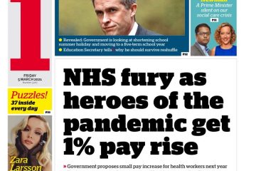 The i leads on next year’s rumoured offer of a 1% pay rise for NHS staff, calling the reaction to the news “explosive”.