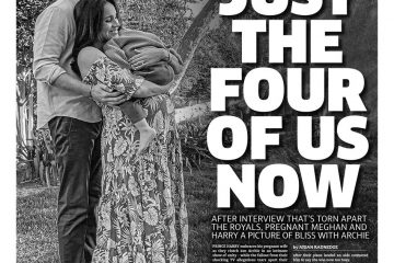 Metro carries a newly released picture of Harry and a pregnant Meghan holding Archie, with the headline: “The war of the Windsors – Just the four of us now.”