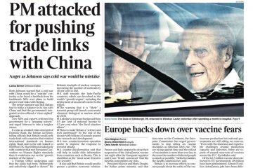 The Times says Boris Johnson warned that a cold war with China would be a “mistake” as he faced a backlash from his backbench MPs over plans to build deeper trade links with Beijing.