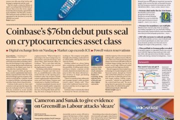 The Financial Times leads on the impressive stock market debut of cryptocurrency exchange firm Coinbase.