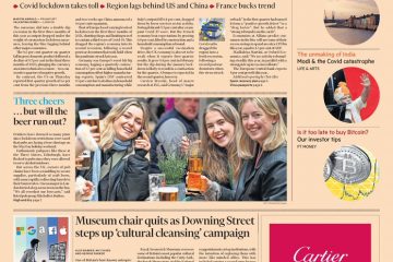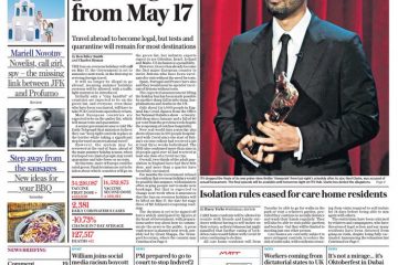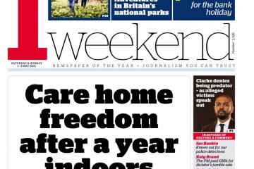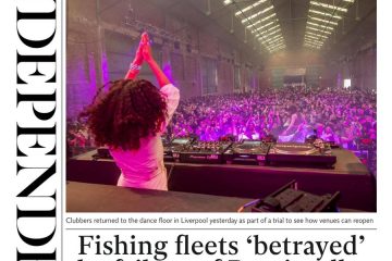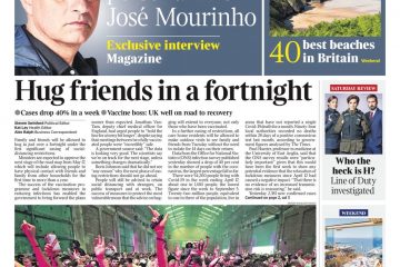 Family and friends will be allowed to hug in just over a fortnight under the first significant easing of social distancing restrictions, The Times writes. The front page also shows 3,000 people filling a warehouse in Liverpool for the UK’s first legal nightclub opening in a year – a trial event where everyone had to produce a negative test before entry.