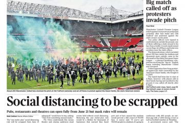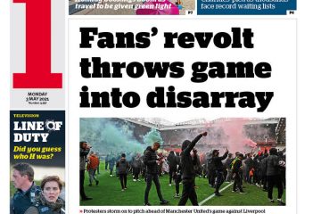 The Daily Mirror leads with more on the calling off of Manchester United’s match against Liverpool after protesters stormed the pitch.