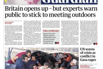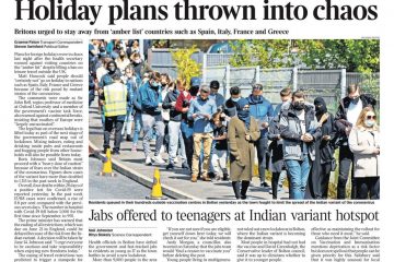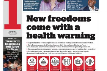 The Daily Mirror writes that millions of people will be able to have a pint inside from Monday and take a foreign holiday as COVID curbs are lifted – though it is feared the surging Indian variant may set back the progress.