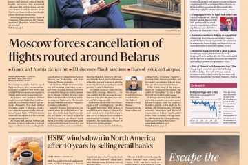 The Financial Times leads on European airlines being forced to cancel flights to Moscow after Russian authorities failed to approve new routes that avoided Belarus’s airspace in response to Minsk’s interception of a passenger jet.