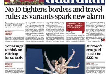 “No 10 tightens borders and travel rules as variants spark new alarm” is The Guardian splash. The paper adds that the Delta variant – first identified in India – may be more likely to “cause serious illness and was circulating more rapidly in schools”.