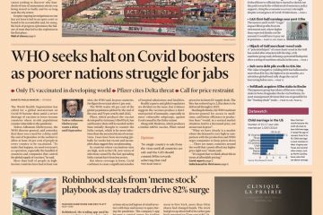 The Financial Times leads with the World Health Organization’s plea for a halt on COVID boosters while poorer nations struggle for vaccines.