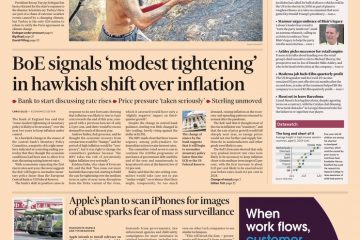 The Financial Times leads with the news the Bank of England has said a modest tightening of monetary policy is likely to be necessary, in a bid to control inflation.