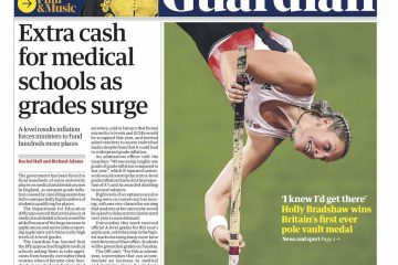 The Guardian leads with the government being forced to fund hundreds of extra university places on medical and dental courses in England amid grade inflation caused by the cancelling of exams.