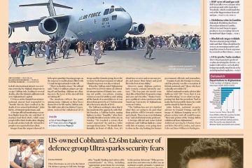 The Financial Times leads with a day of chaos in Kabul, as desperate Afghans and foreigners flee from the Taliban, the militant Islamist group which took the Afghan capital during the weekend.