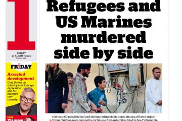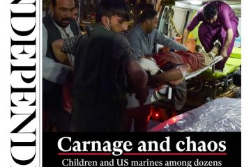 The Daily Mail leads on the “tragic price of surrender” as 12 US soldiers are among the dozens of victims killed in an explosion at Kabul airport.