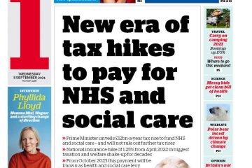 Boris Johnson’s plan to raise taxes by the highest amount since the war has made the front of The Daily Telegraph.