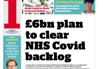 The Daily Express has more details about Rishi Sunak’s £6bn pledge for the NHS, including at least 100 community diagnostic centres to slash waiting times for clinical tests.