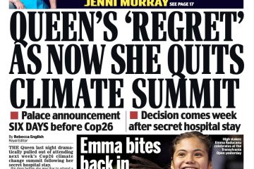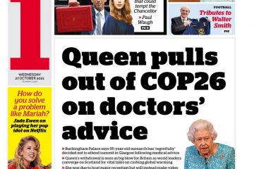 The Daily Mail splashes on how the Queen has pulled out of the COP26 summit, with the decision announced after a “secret hospital stay”, the newspaper claims.