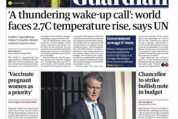 The Guardian leads on how the world faces disastrous temperature rises of at least 2.7C if countries fail to strengthen their climate pledges, according to a UN report.
