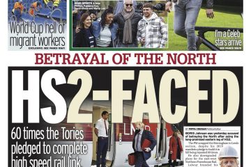 The Daily Mirror leads on the news the Prime Minister has scrapped the Birmingham to Leeds section of HS2 – despite a pledge in his 2019 manifesto to build it in full being repeated 60 times.