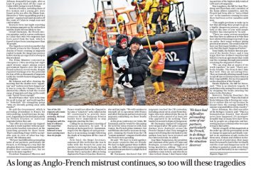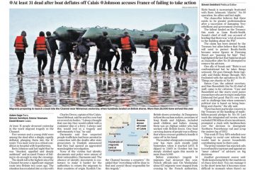The migrant deaths on the Channel also features on the front of The Daily Telegraph. The prime minister has asked France to “step up” and help stop smugglers.