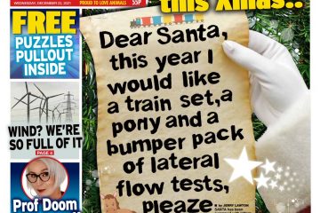 Santa has been “swamped with letters pleading for this year’s must-have toy – a luxury box of lateral flow COVID test kits”, reports the Daily Star.