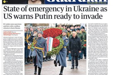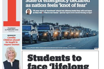 The paper reports that Ukraine has declared a state of emergency, mobilised its reserves and told nearly 3 million of its citizens to leave Russia.