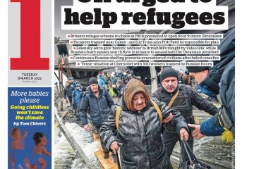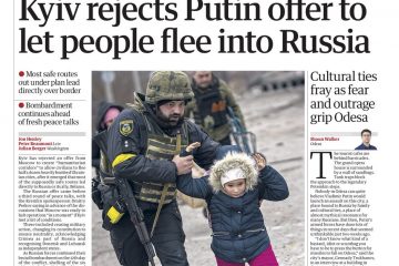 The Guardian leads with Ukraine’s rejection of Russia’s offer of safe corridors for refugees. It has emerged that most of the corridors lead to Russia or its ally Belarus.