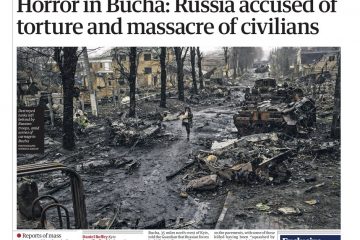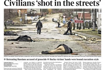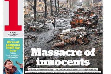 The Times leads on the civilian deaths in Ukraine, alongside an image of the aftermath in Bucha with bodies sprawled on the ground.