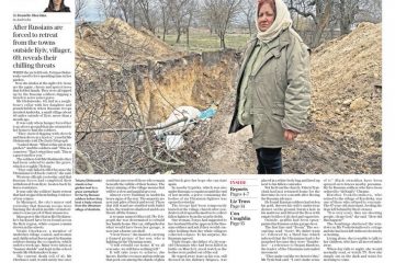 The Daily Telegraph leads with a dispatch on a Ukrainian woman in the village of Andrivka – around 40 miles outside of Kyiv – that was invaded by Russian troops while she hid in her neighbour’s cellar.