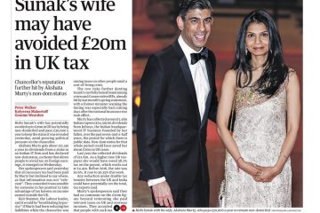 The Guardian reports that Rishi Sunak’s wife has potentially avoided up to £20m in UK tax by being non-domiciled and pays £30,000 a year to keep the status, amid growing pressure on the chancellor.