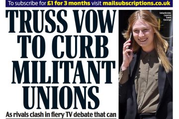 The Daily Mail’s front page features the pledge by Tory leadership frontrunner Liz Truss to reduce union power by ensuring a minimum level of service for roads, railways, and gas utilities.