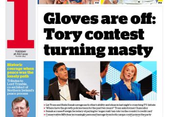 A report in The i highlights Rishi Sunak’s claim that Liz Truss is promising “sugar rush” tax cuts “on the country’s credit card”, while she responds by saying he has failed to grow the economy.