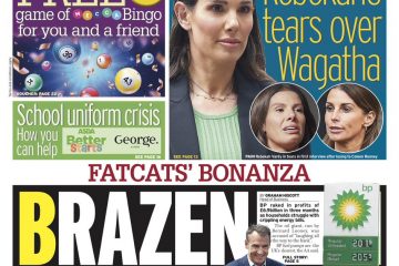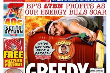 “Greedy Bleeders” headlines Wednesday’s Daily Star, a report on BP’s nearly £7bn profits.