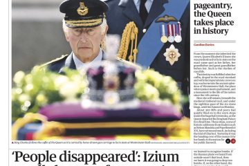 The Guardian features a picture of Prince Charles following his mother’s coffin, as well as an article about the occupation of Izium.