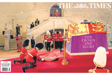 There is an image of the Queen lying in state on the front of The Times, along with the quote “Grief is the price we pay for love.”.