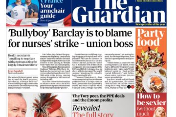 The Guardian’s front page quotes the head of Britain’s nursing union as saying the health secretary is a “bullyboy” who won’t negotiate with her because she represents a predominantly female workforce.