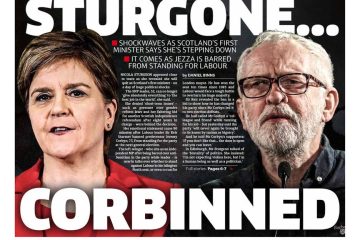 “Sturgone” and “Corbinned” are the headlines on Metro, as Nicola Sturgeon has announced she will resign and Jeremy Corbyn has been barred from running for Labour again.