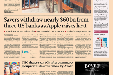 The Financial Times reports that three big US financial groups experienced bank deposit outflows of almost $60 billion in the first quarter.